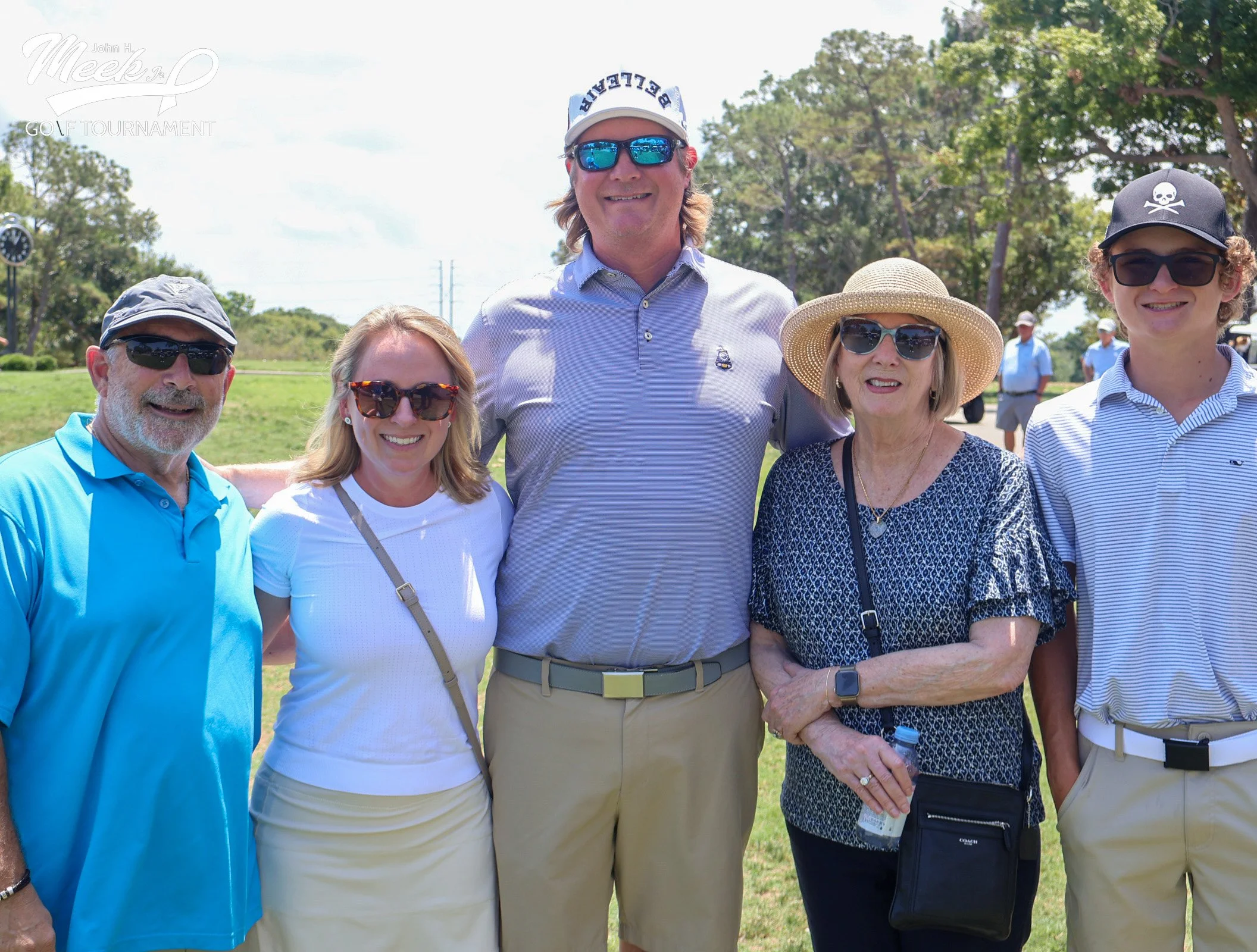 Group of six people sitting at a white table outdoors under a large umbrella, smiling at the camera. They appear to be at a golf tournament, as indicated by the logo and text in the top-left corner of the image. The background includes greenery, palm trees, and a partly cloudy sky.