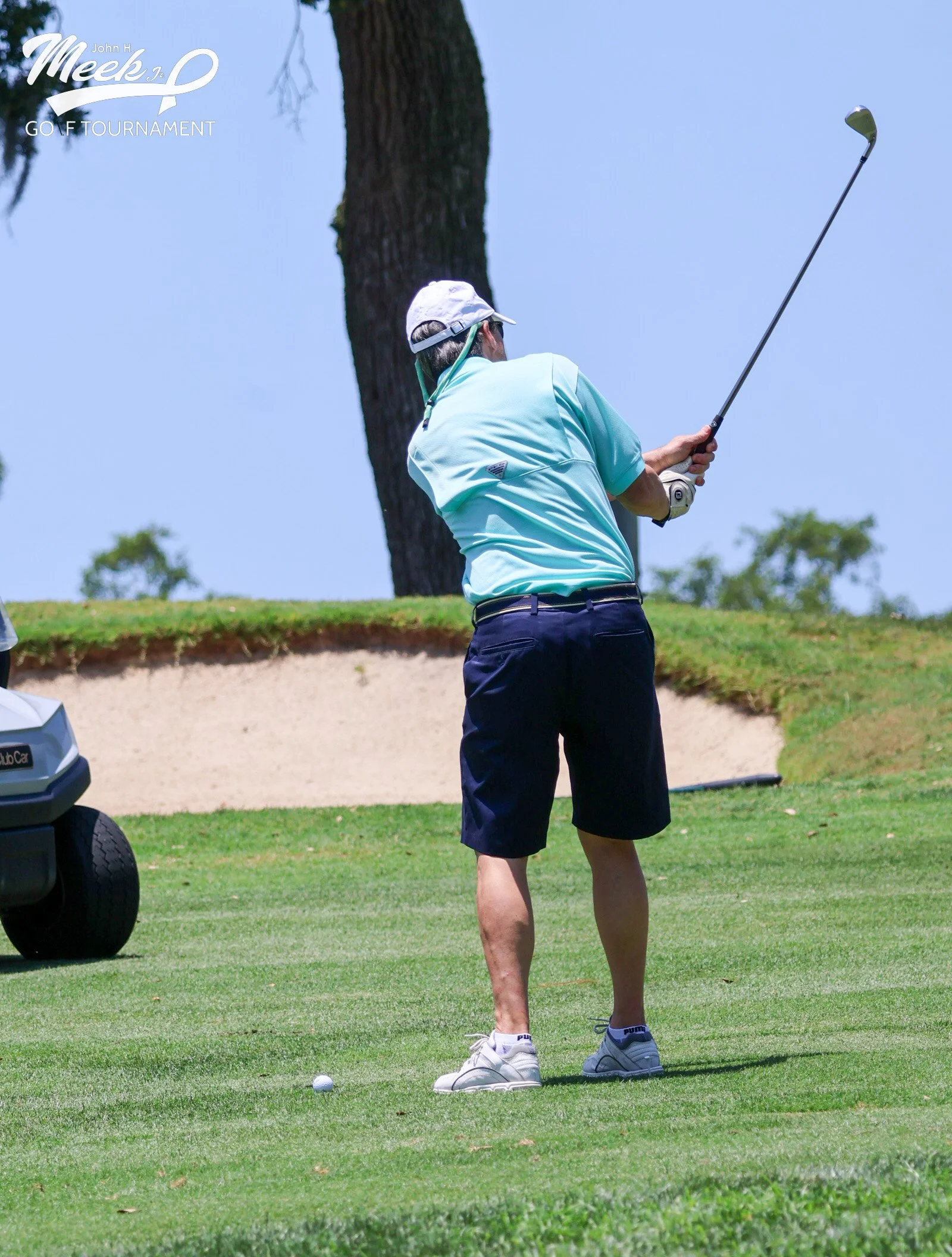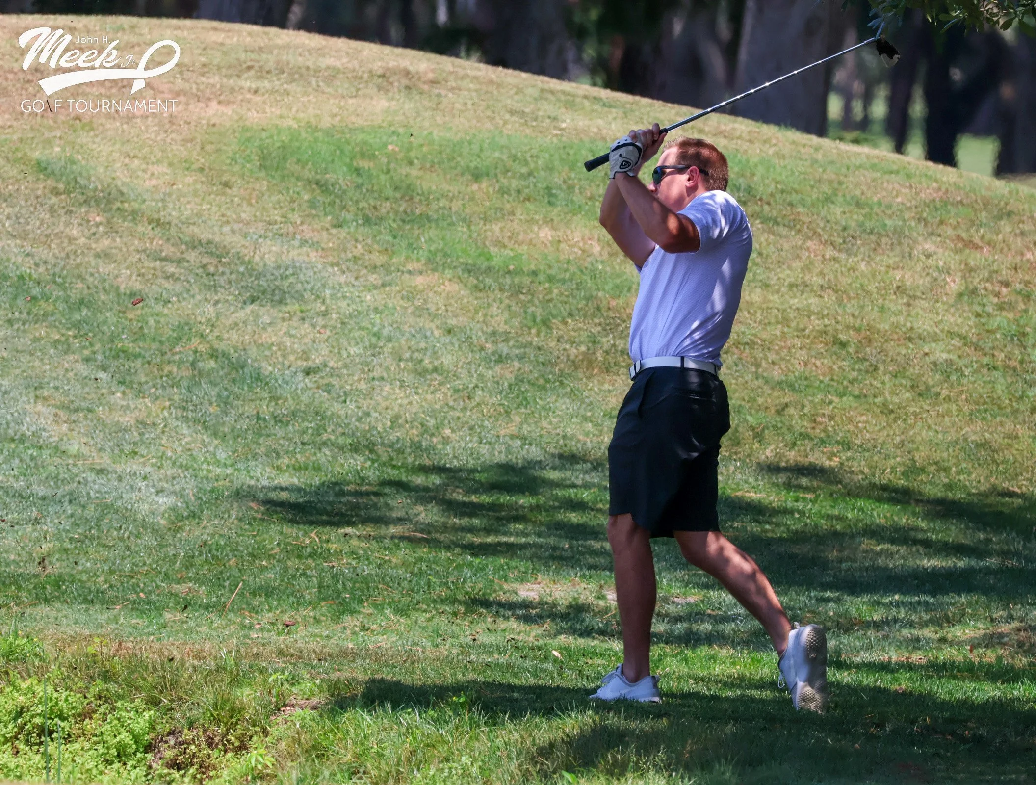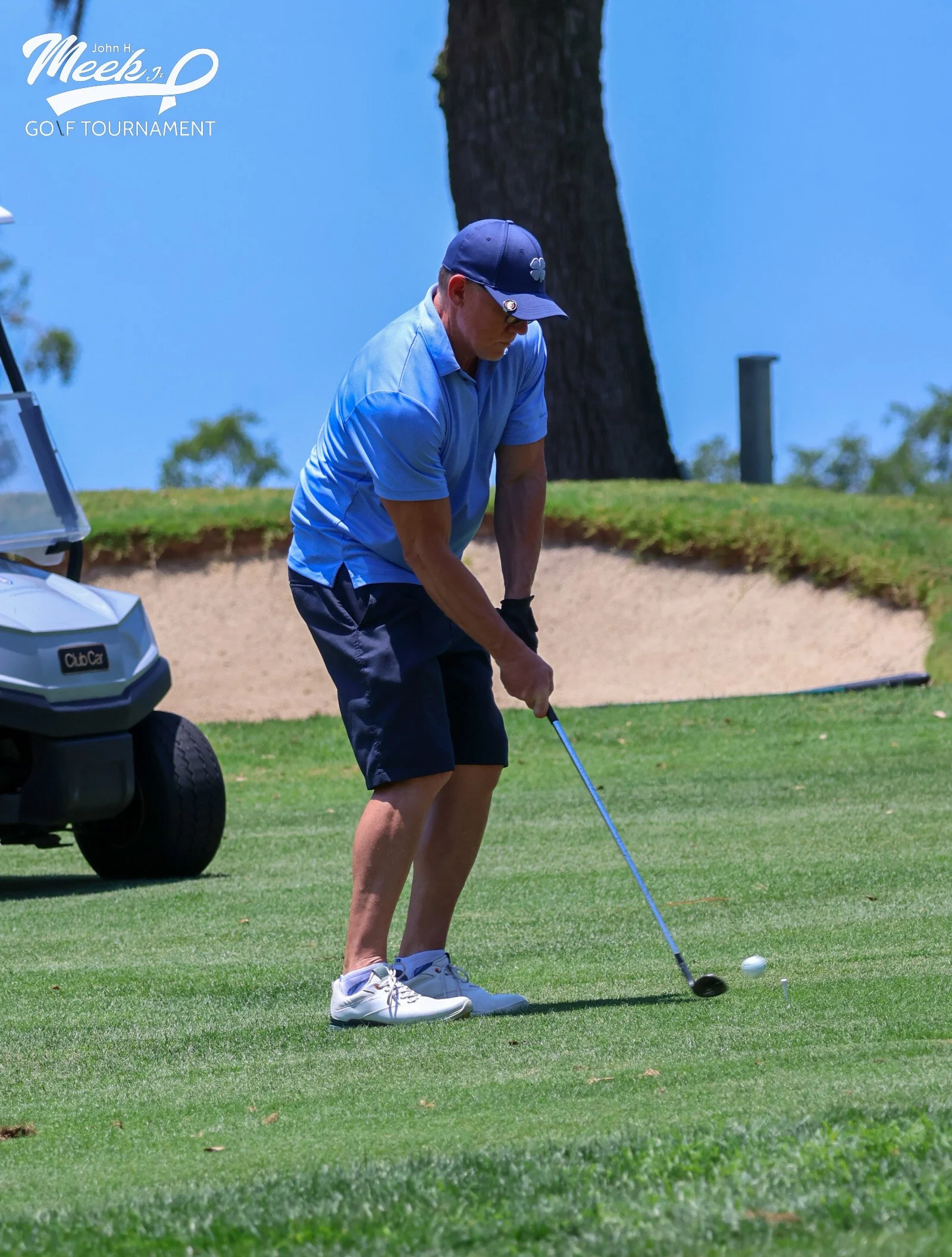 A man swinging a golf club on a golf course with trees and golf carts in the background, participating in the John H. Meek Golf Tournament.