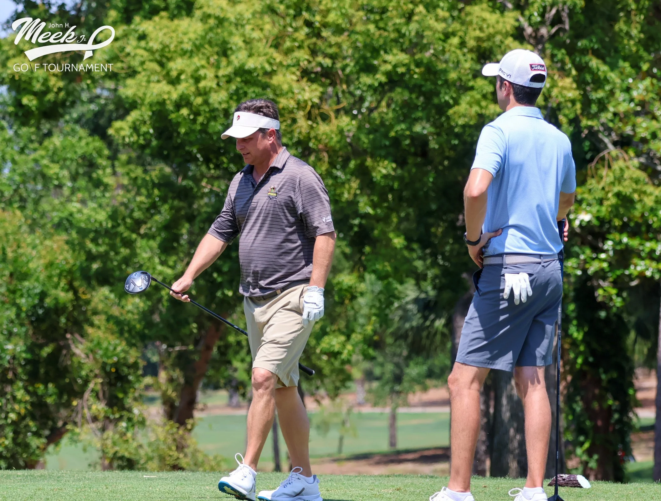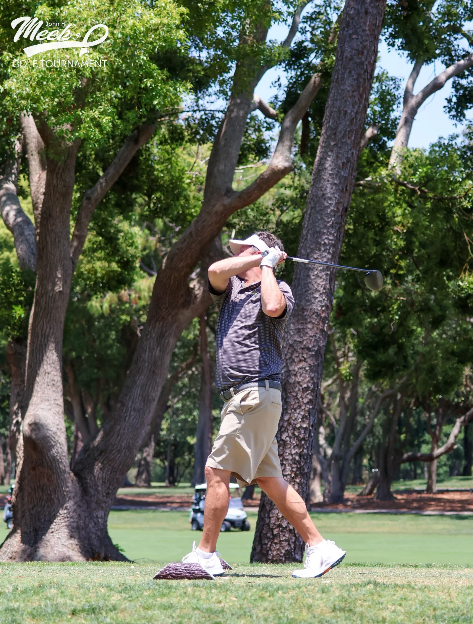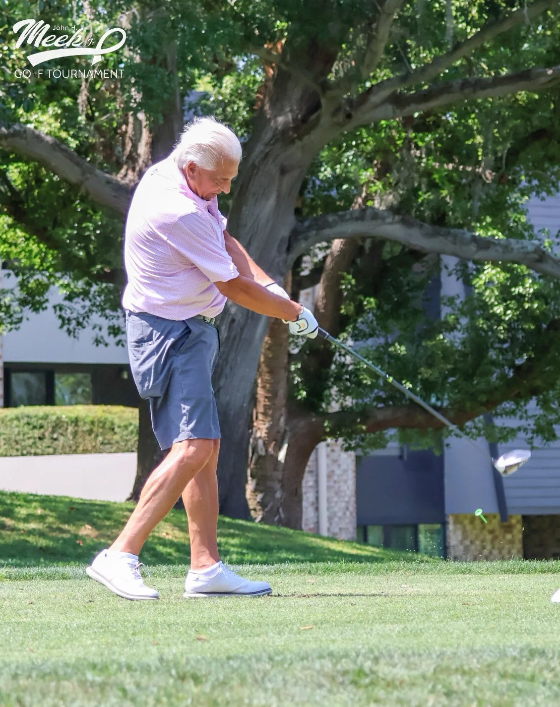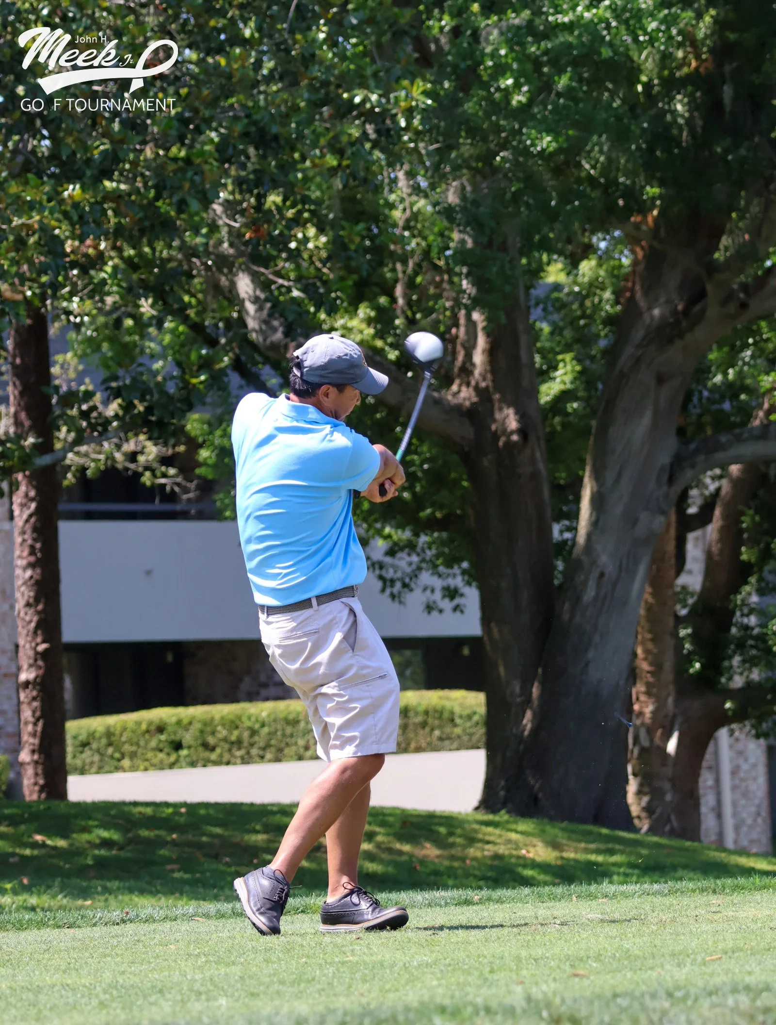 A man swinging a golf club on a golf course with trees and golf carts in the background, participating in the John H. Meek Golf Tournament.