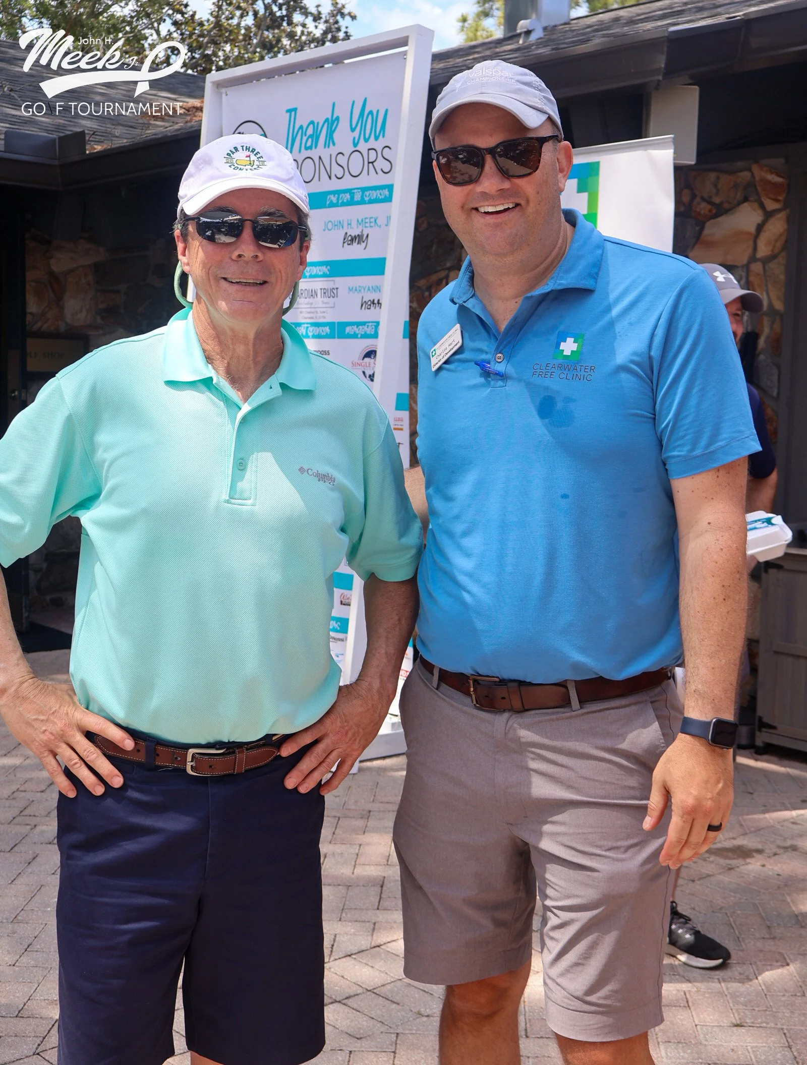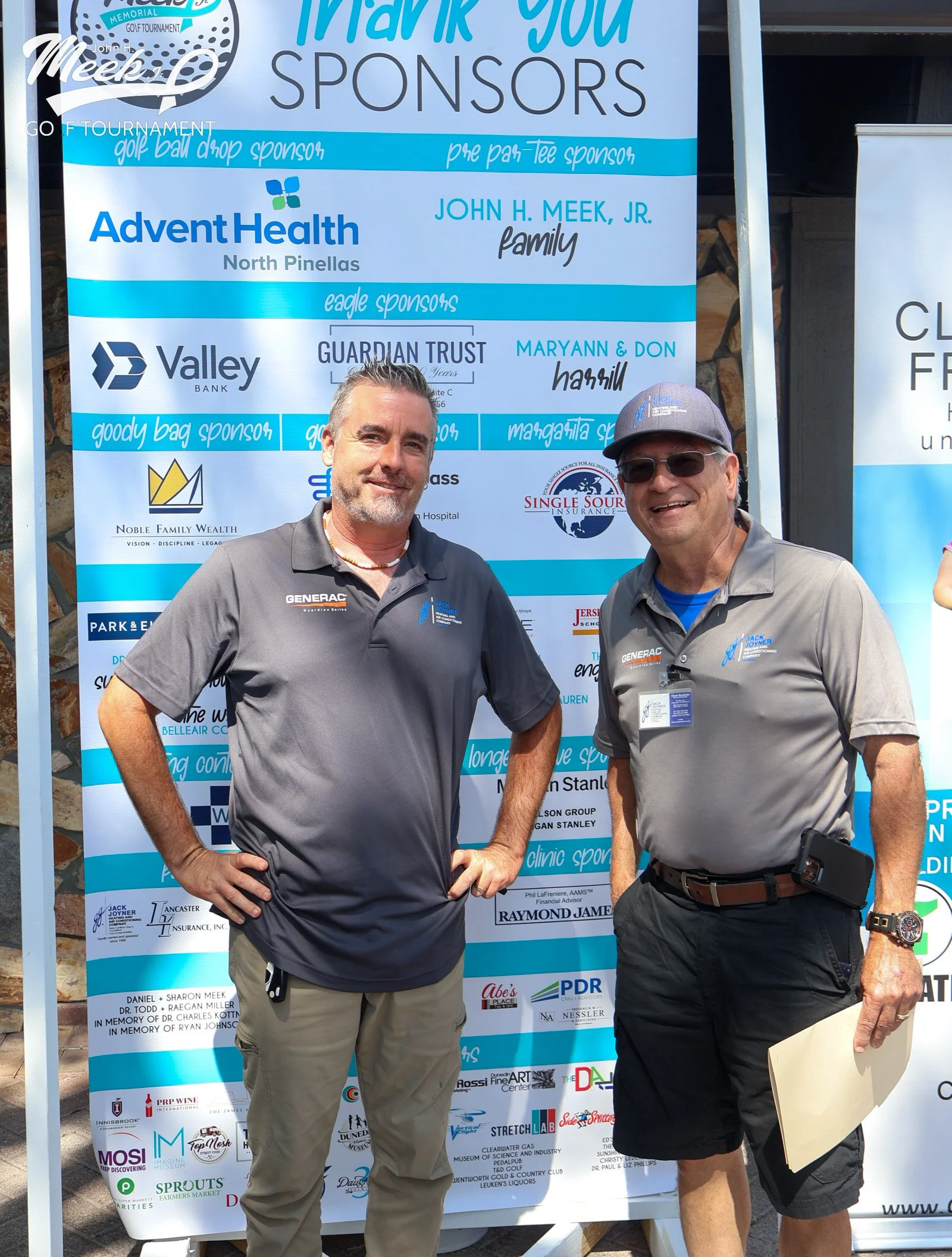 Two men standing in front of a sponsorship board at a golf tournament, smiling and posing for the photo.