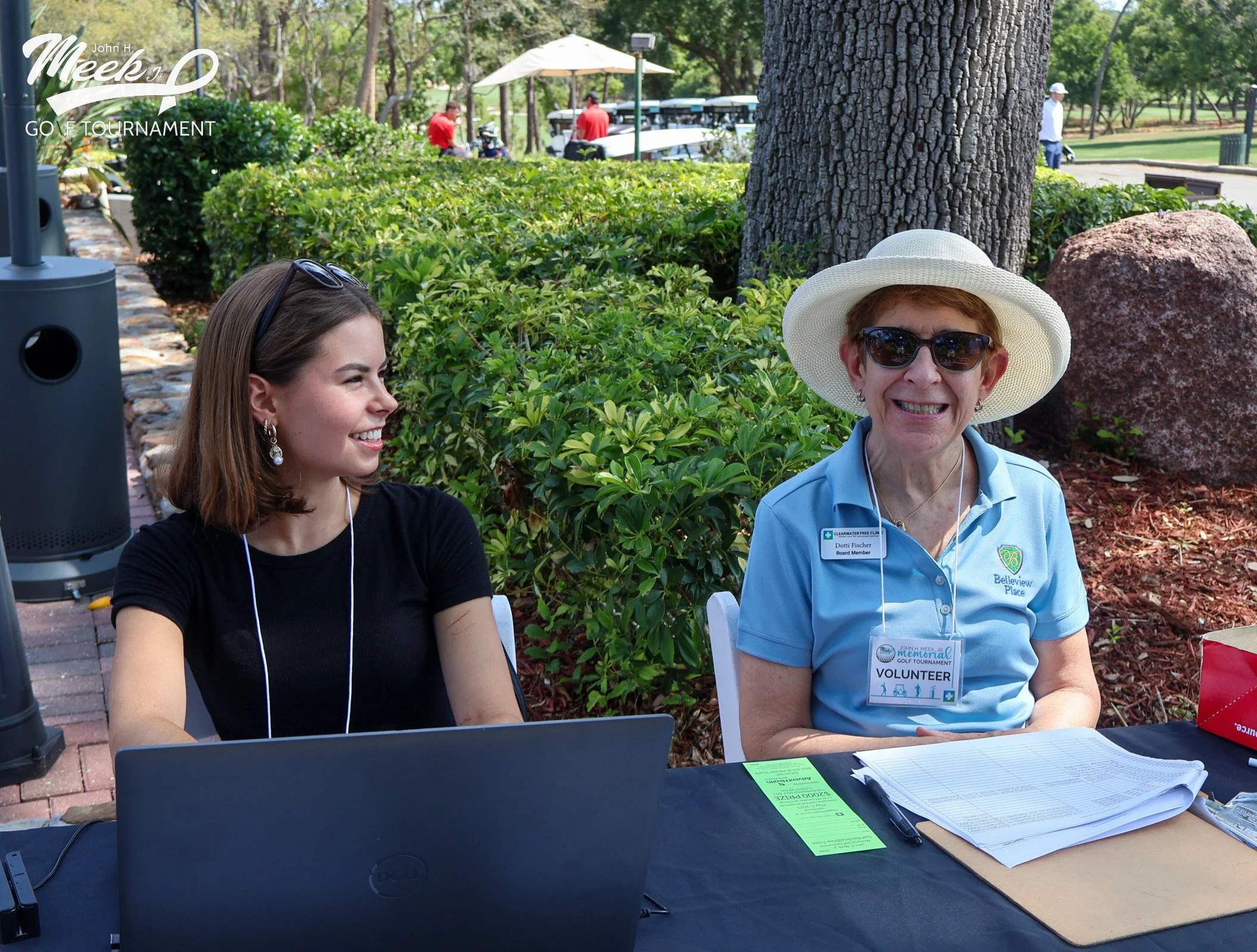 Two smiling women with sunglasses sitting at a table outdoors during daytime at the Meek J Golf Tournament, with printed materials and a pen in front of them.