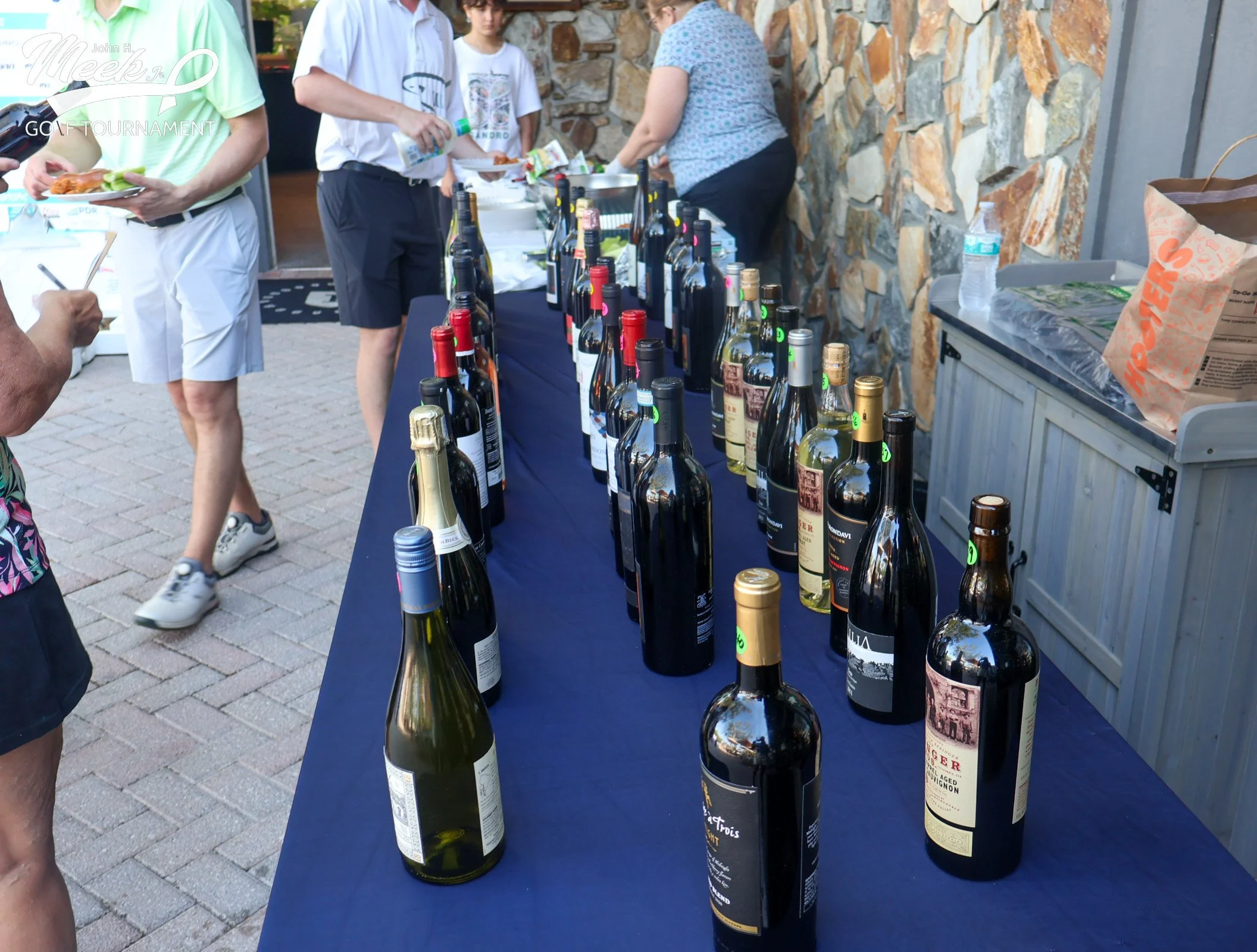 A table with numerous bottles of wine at an outdoor event with people in casual attire in the background.