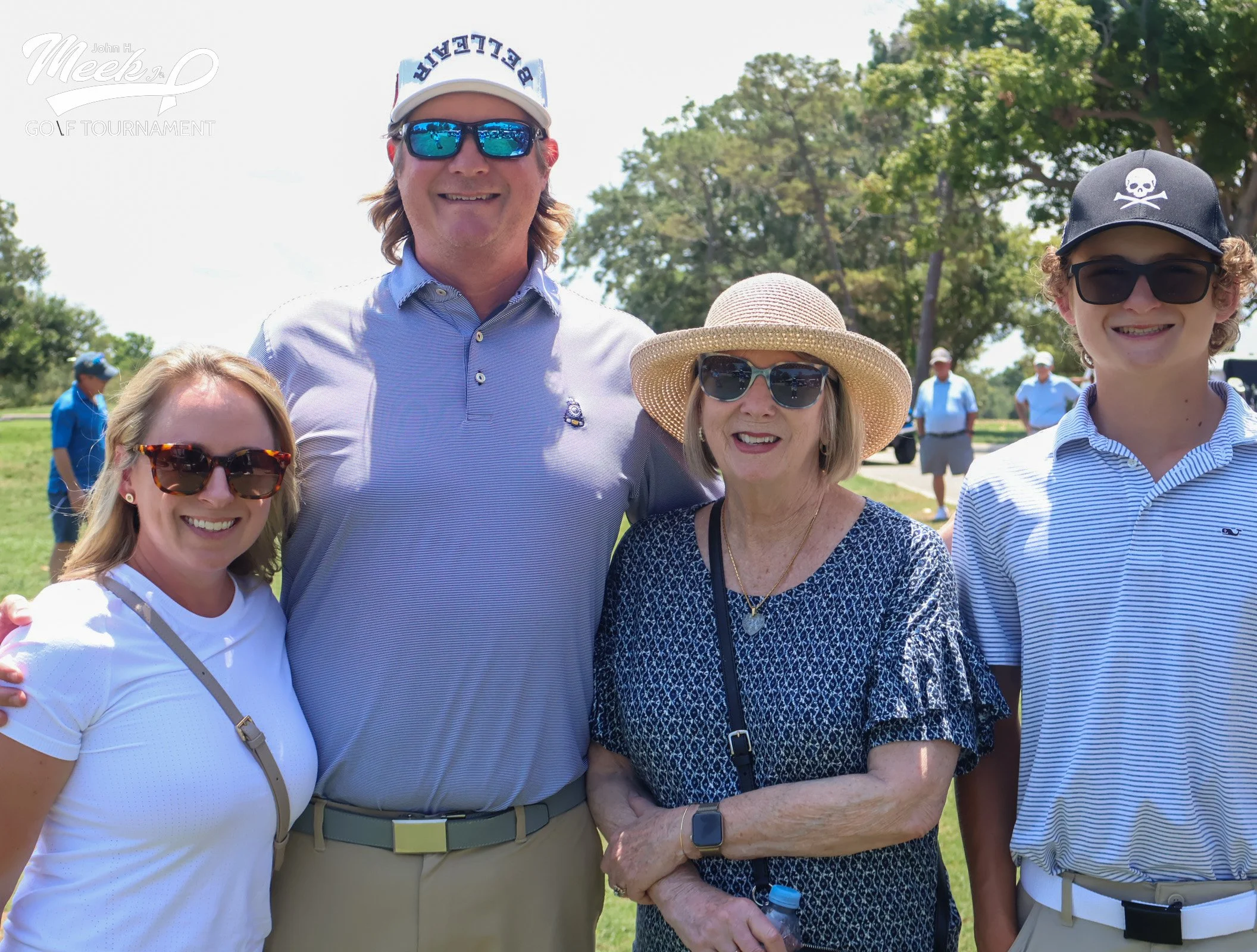 Four people standing on a golf course, smiling and holding golf clubs, dressed in golf attire including shorts and polos, with trees in the background.