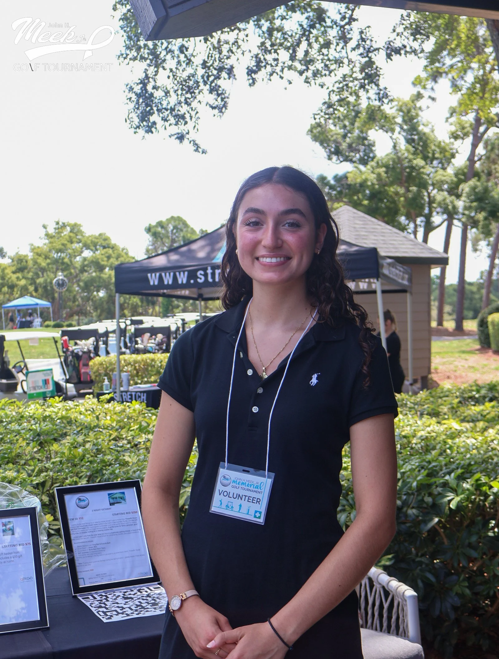 A young woman with brown hair and a black polo shirt, smiling and standing outdoors at a golf tournament event, wearing a volunteer badge around her neck.