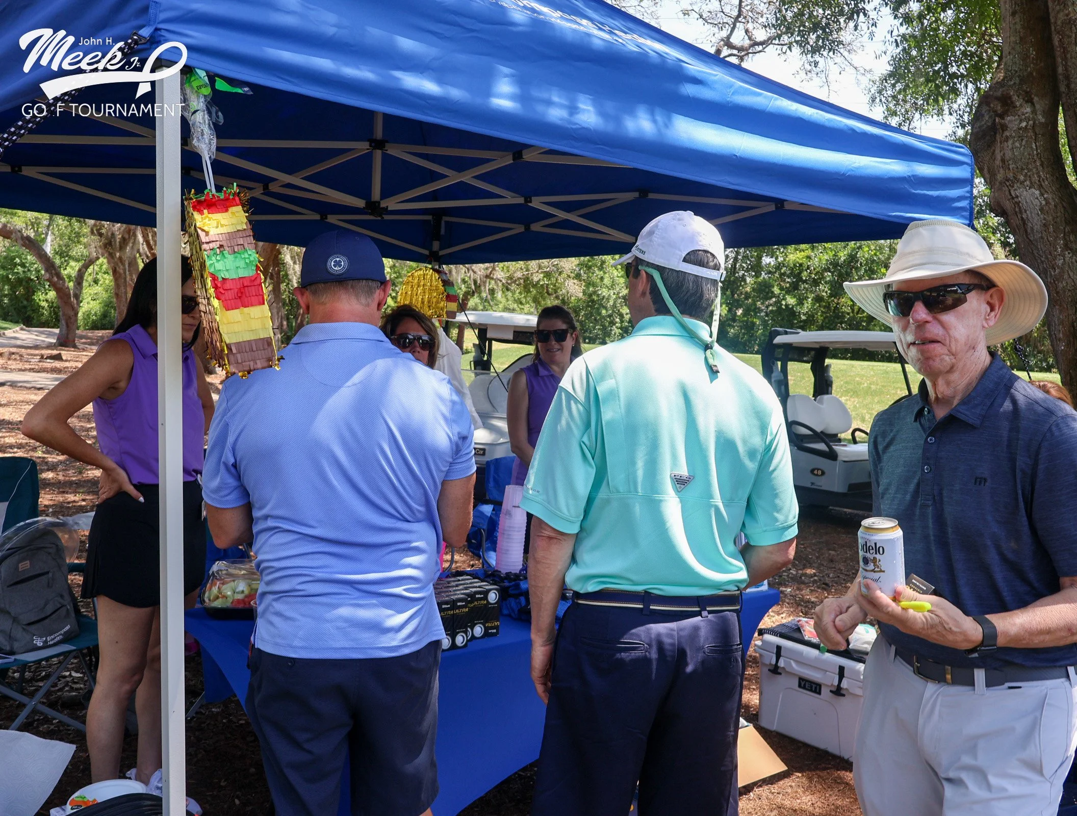 Group of people gathered under a blue canopy tent at a golf event, with golf carts and trees in the background.