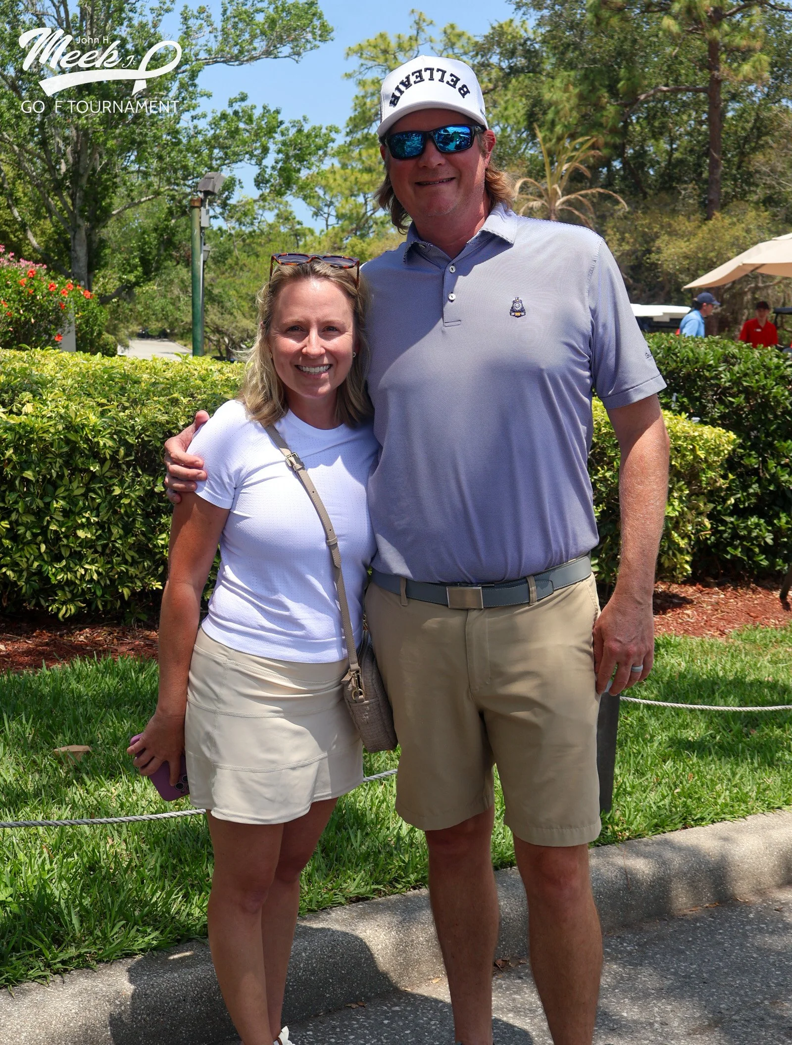 Smiling woman and man posing outdoors at a golf tournament, with trees and clear sky in the background.