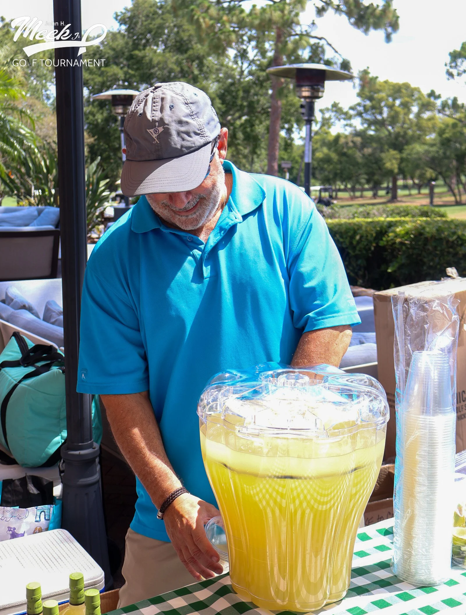 A man in sunglasses, a blue polo shirt, and a hat stands behind a table with a large glass container filled with yellow lemonade, outdoors at a golf event.