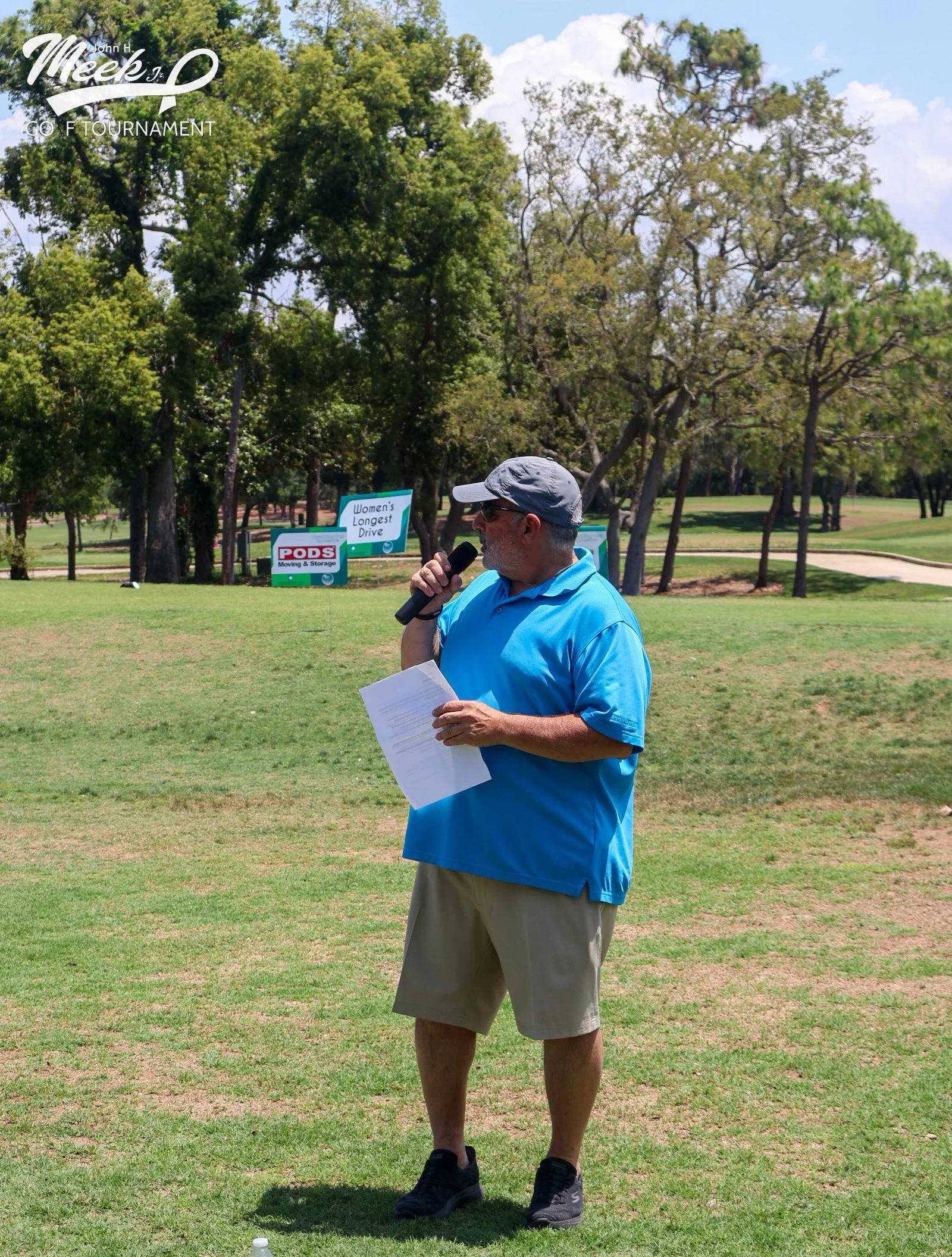 A man in a blue polo shirt and khaki shorts stands on a grassy golf course, holding a microphone and reading from a piece of paper, with trees and sponsor signs in the background.