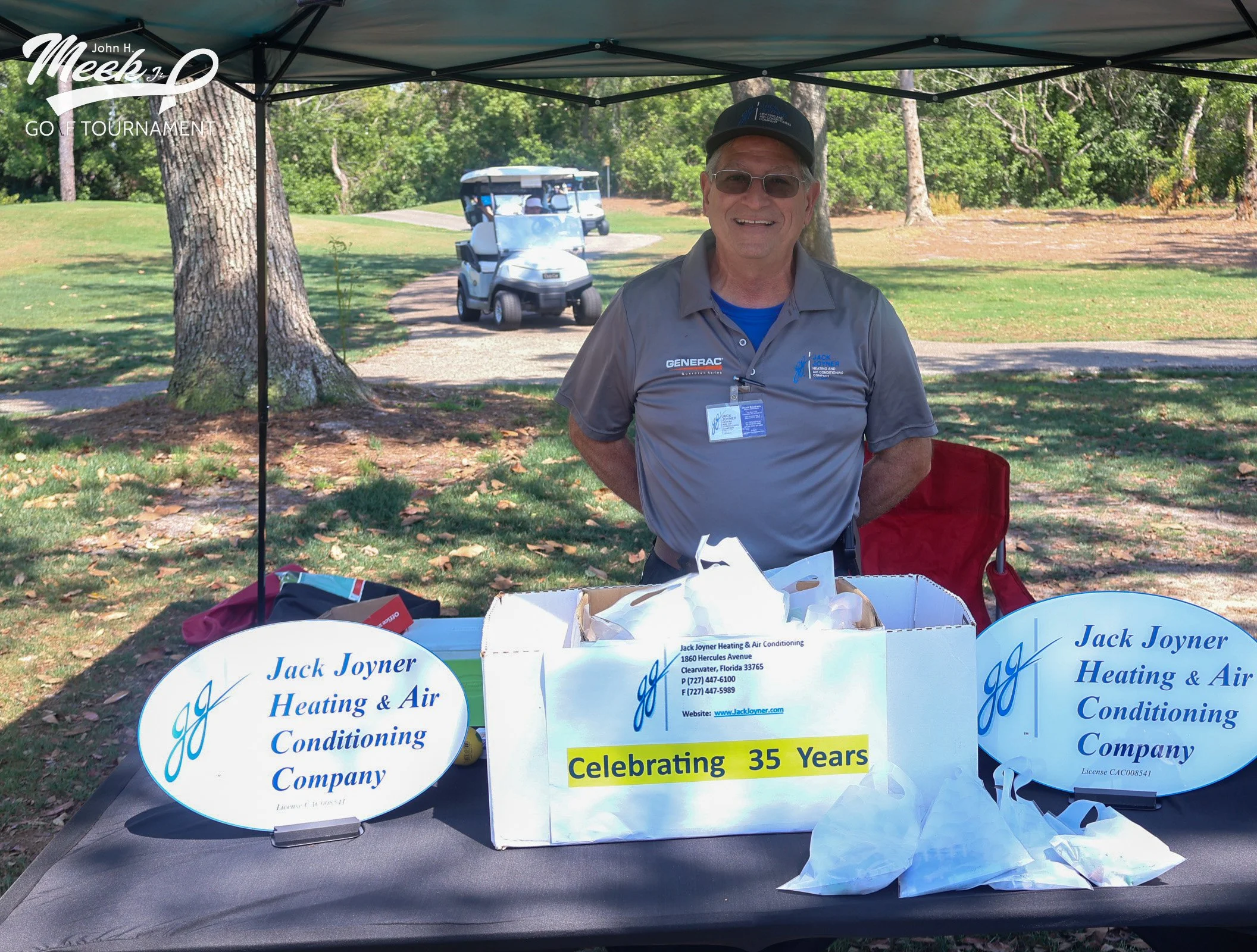 A man standing behind a table at an outdoor event for Jack Joyner Heating & Air Conditioning Company, celebrating 35 years. The table has signs with the company’s name and a box with tissues. There’s a golf cart in the background among trees and green grass.