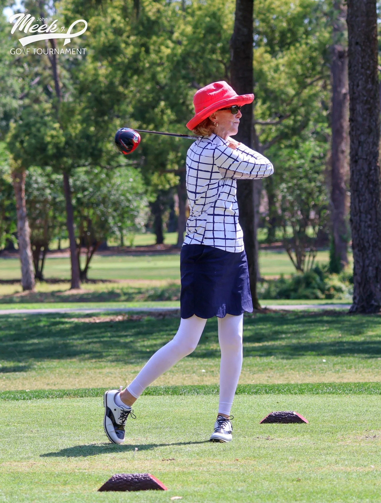 A woman swinging a golf club on a golf course, wearing a red hat, sunglasses, a checkered shirt, a dark skirt, white leggings, and golf shoes, with trees in the background and the logo of the John H. Meek Jr. Golf Tournament in the top left corner.