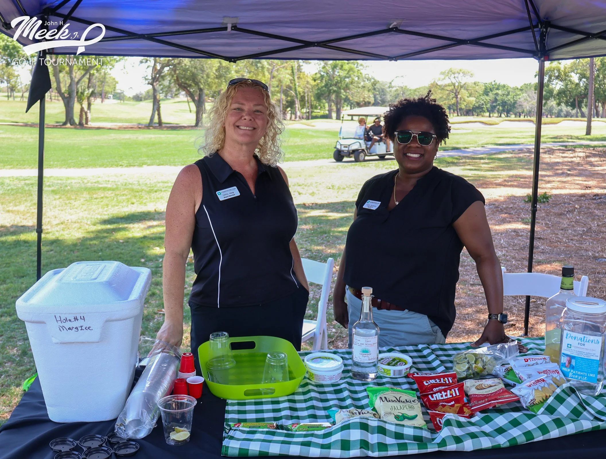Two women standing behind a table at a golf tournament, smiling, under a canopy. The table has snacks, drinks, and a donation jar, with a golf course and a golf cart in the background.