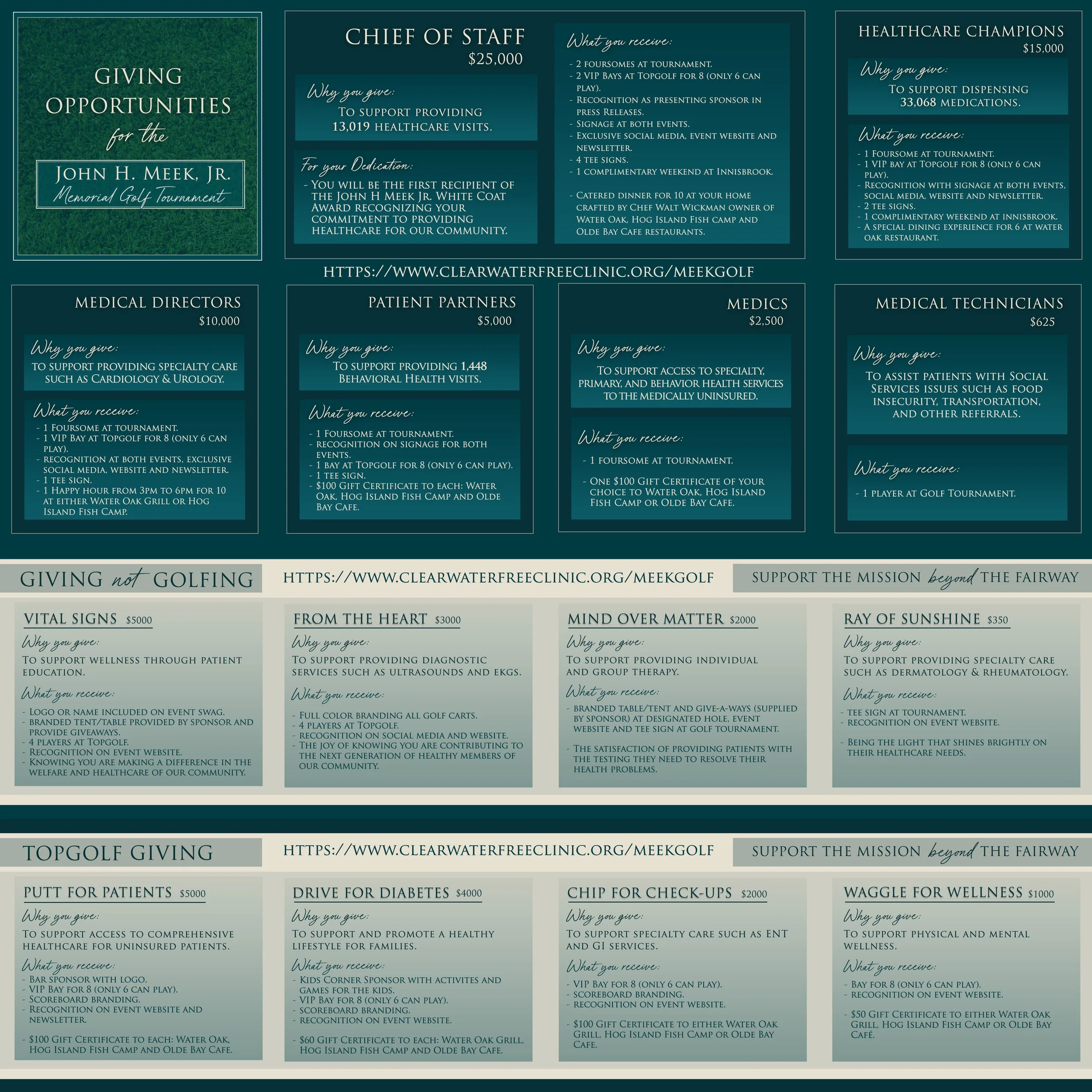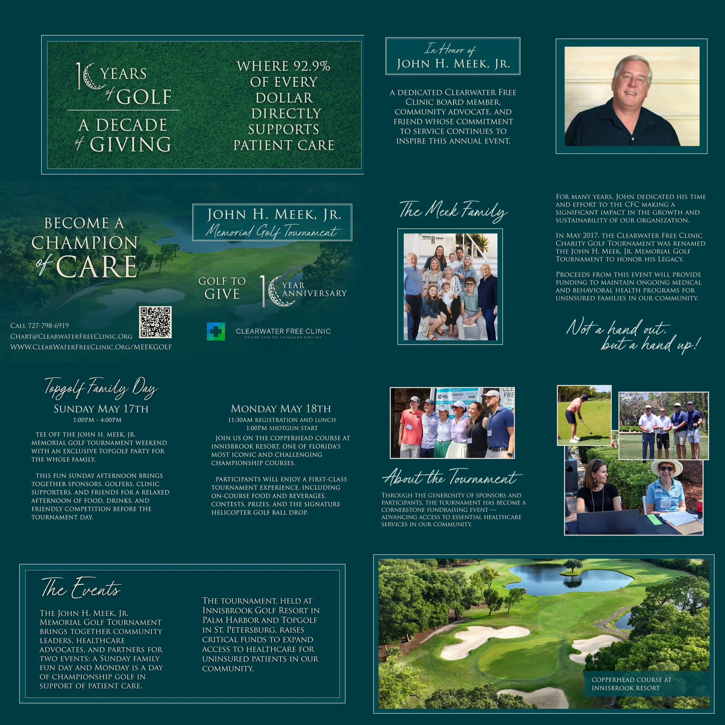 Sponsorship opportunities provide meaningful visibility throughout tournament day while supporting free, high-quality healthcare for uninsured families served by the Clearwater Free Clinic. Packages range from exclusive presenting sponsorships to individual on-course recognition.