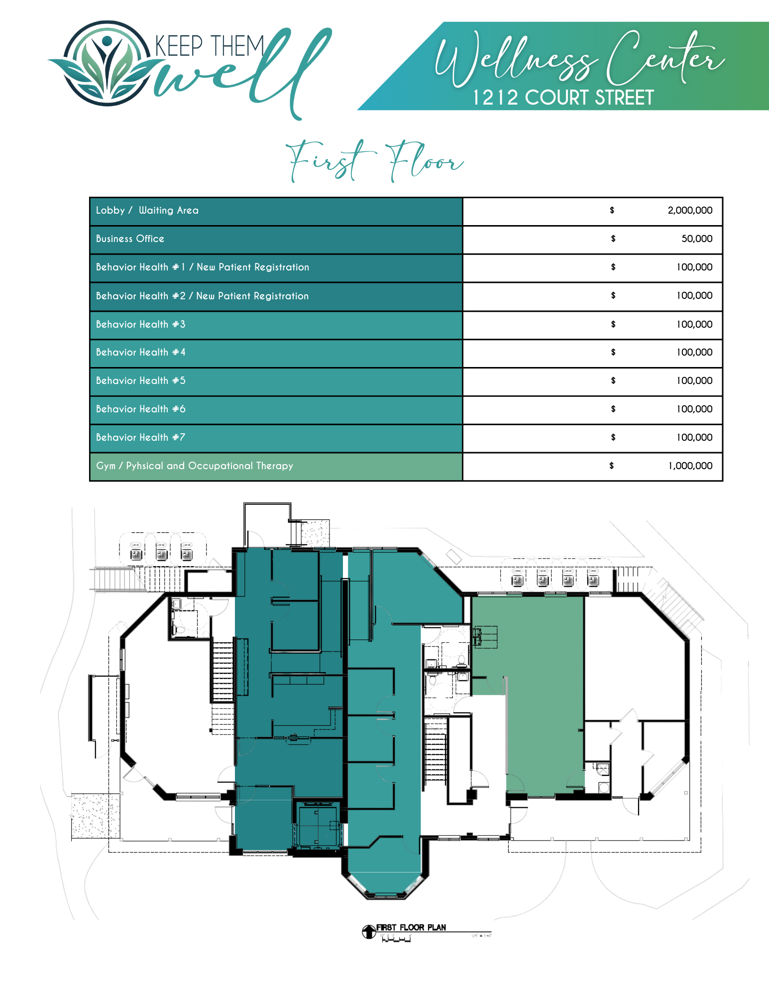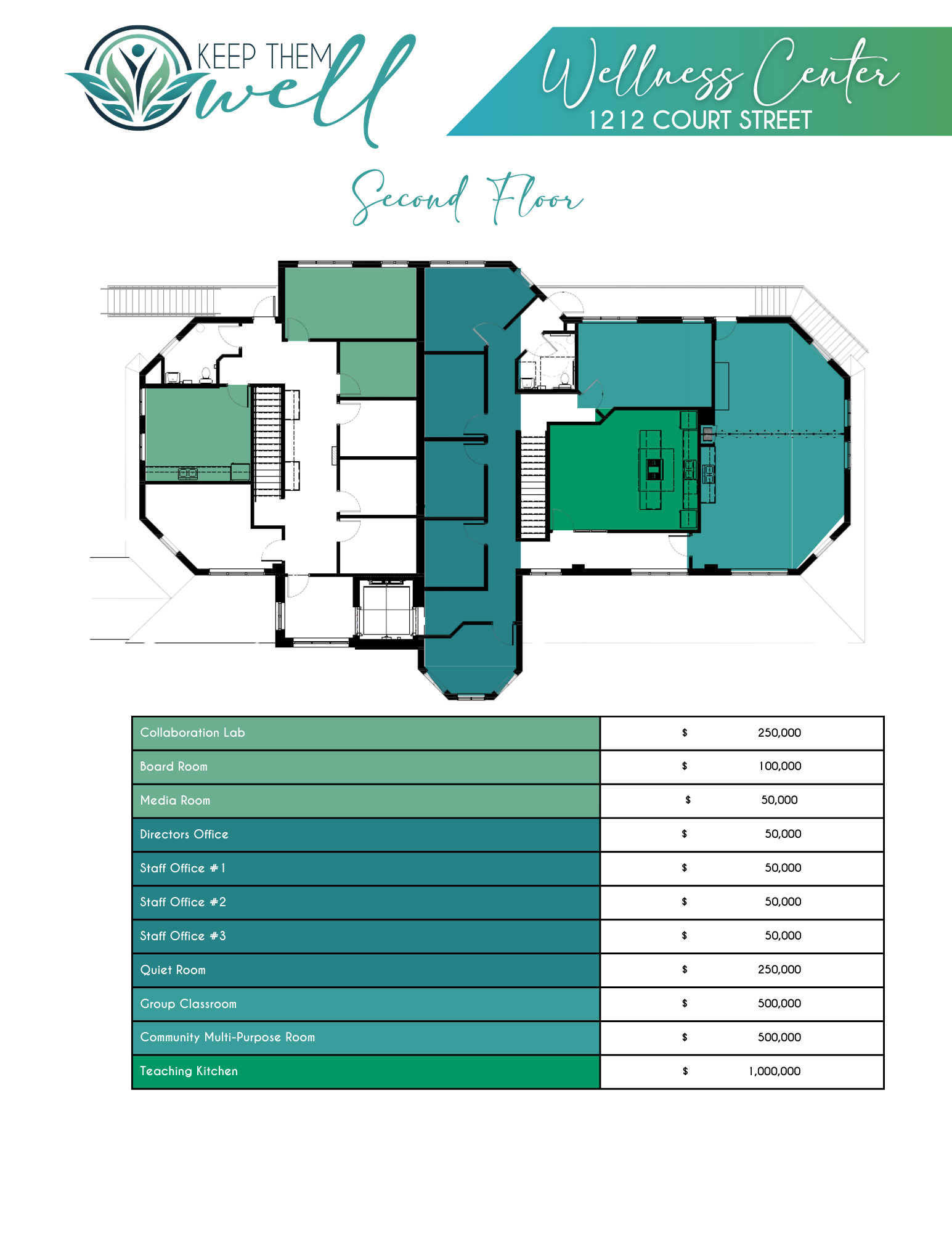 The second floor serves as the heart of our strategic growth and community engagement. Development and donor relations offices occupy a suite of bright workspaces where our team cultivates vital partnerships and stewards gifts that make this vision possible. Group therapy classrooms offer flexible layouts for mental-health support groups and wellness workshops, while the adjacent Teaching Kitchen turns pantry staples from the Food Clinic into hands-on cooking lessons that build lifelong skills. Finally, expanded multipurpose rooms provide ample space for event prep, group classes, and community gatherings—ensuring that patients and supporters alike can connect, learn, and celebrate together.