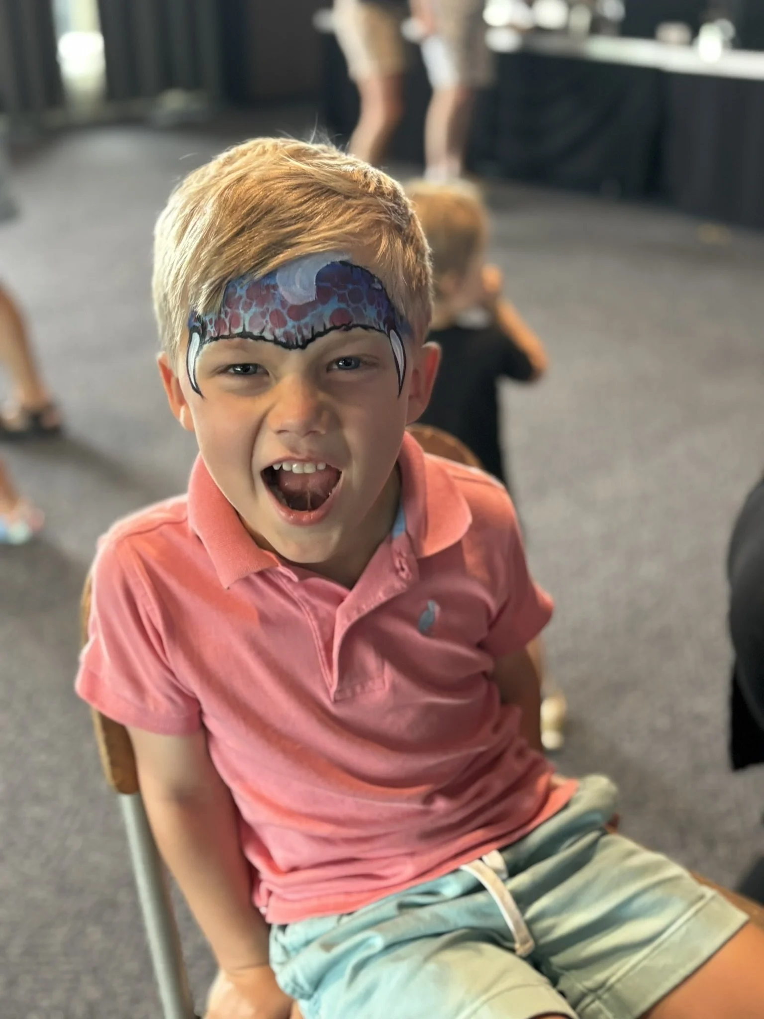Young boy with face paint smiling, wearing a pink shirt and sitting indoors, with blurred background.